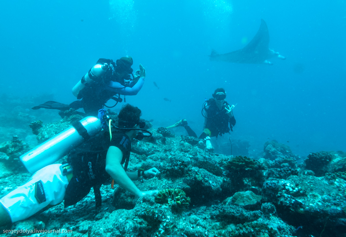 Мы примерно знали район где обитают манты. Приплыв туда заранее, наши дайверы опустились на глубину 18 метров и начали выманивать скатов (они обычно держатся ближе ко дну):