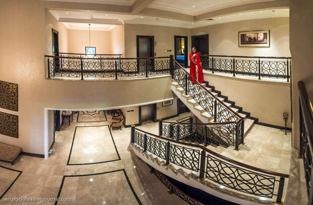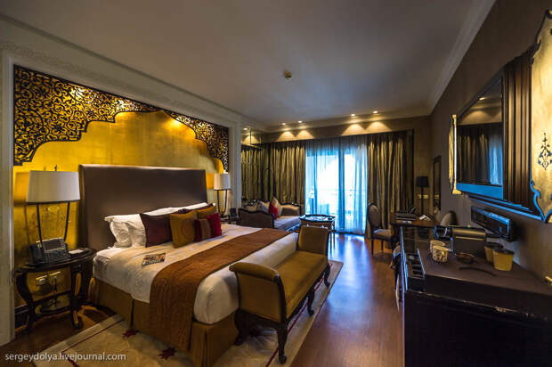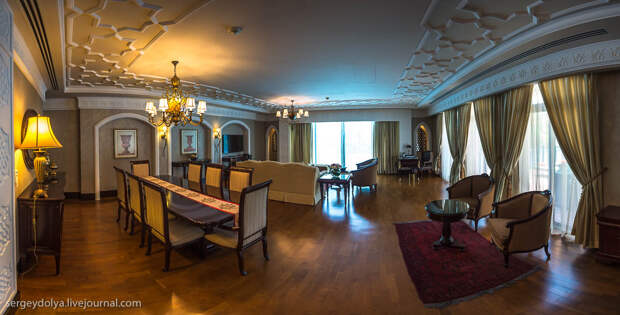 Но самый дорогой номер остался за кадром. Так выглядит его гостиная. Арабы не любят большие спальни, но обожают роскошные и просторные общие зоны: