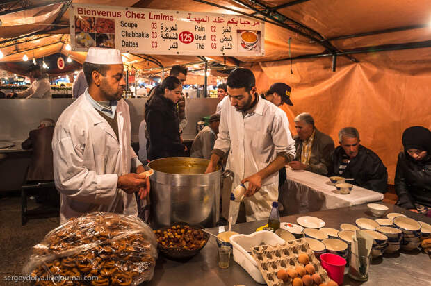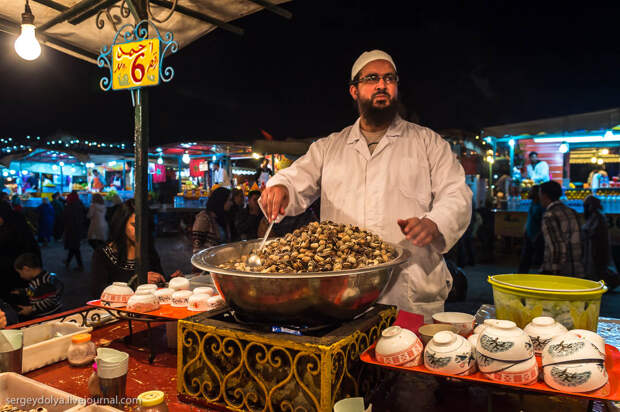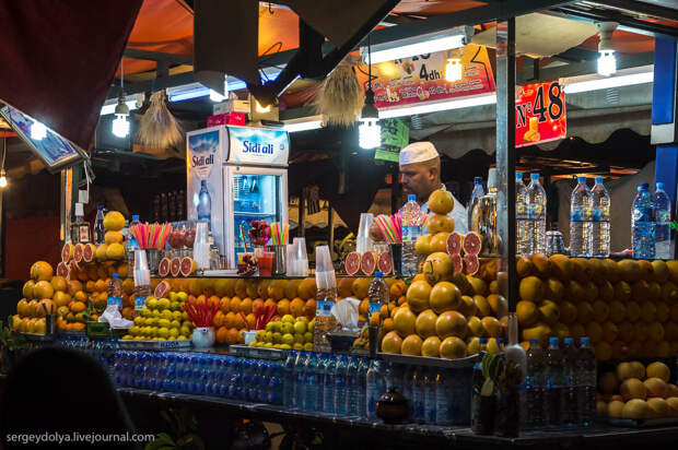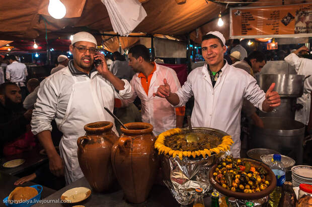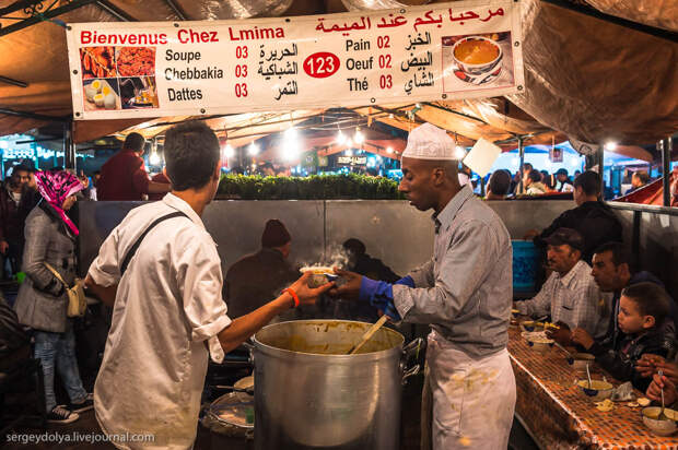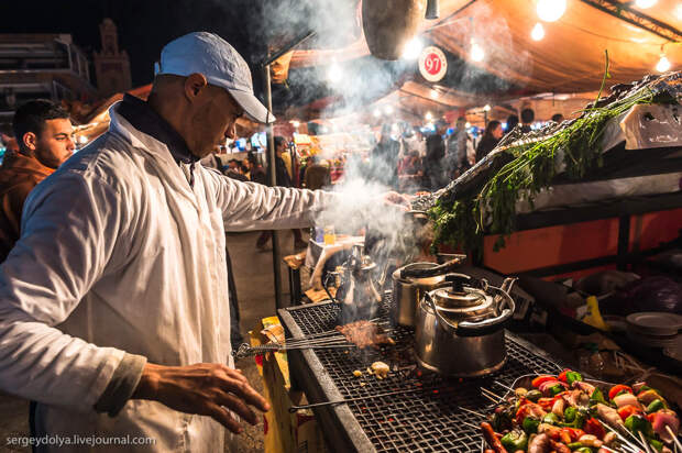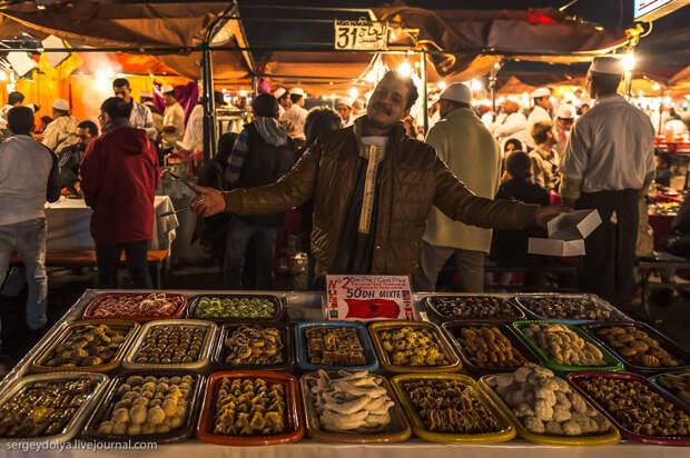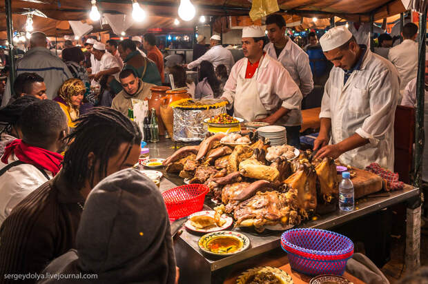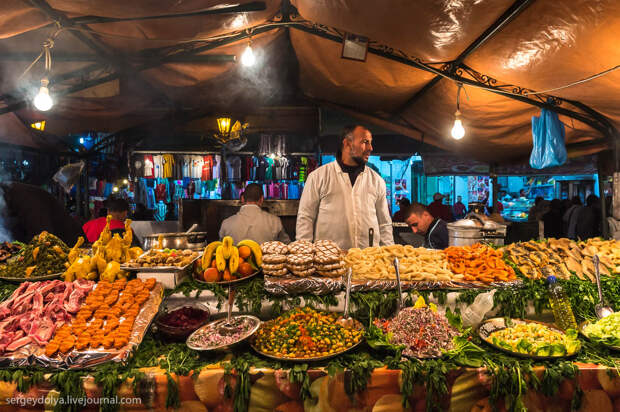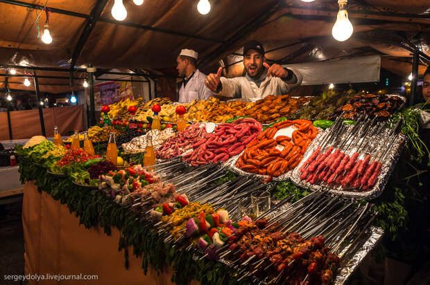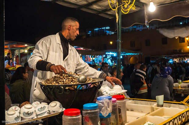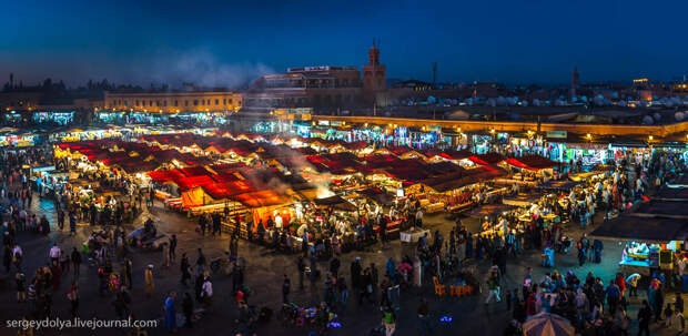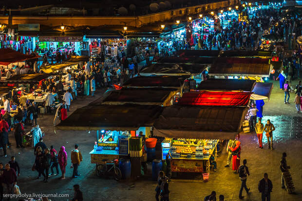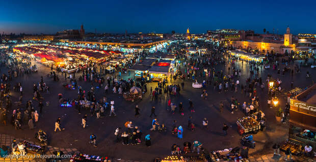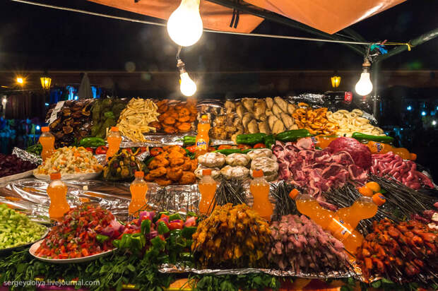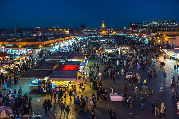 Площадь Джемаа аль-Фна в в городе Марракеш - самый красочный рынок Марокко, настоящий театр под открытым небом. Днем она не представляет ничего особенного, зато ночью всё пространство площади загорается тысячами огней ресторанчиков и лавок. Пикантности добавляет тот факт, что Джемаа аль-Фна переводится как "Площадь мертвецов". До 19 века она использовалась для торговли рабами, а так же служила местом публичных казней. Хотя, учитывая те времена и нравы, цель была ровно та же - дать людям хлеба и зрелищ.