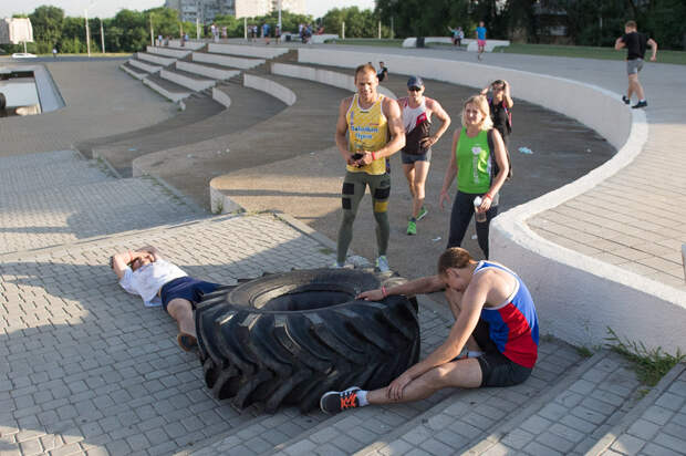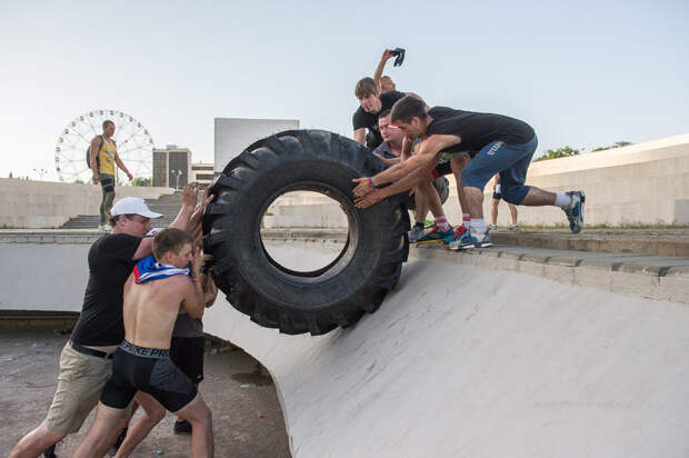 В конце участка необходимо закатить шины на ступеньки. И вот здесь ситуация могла кардинально измениться в один момент. Признаюсь, оставаться в стороне было сложно - временами и я, и съемочная группа помогали участникам: