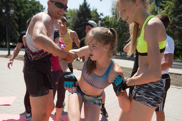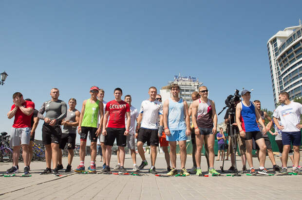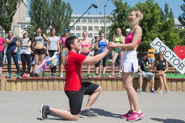 Но давайте посмотрим как проходит фитнес-битва. Мы выбираем центральное место в городе и приглашаем туда участников. В Ростове-на-Дону была набережная. Первый делом необходимо взять со всех согласие на съемки. Документы подписываются на месте, на коленках и на спинках:
