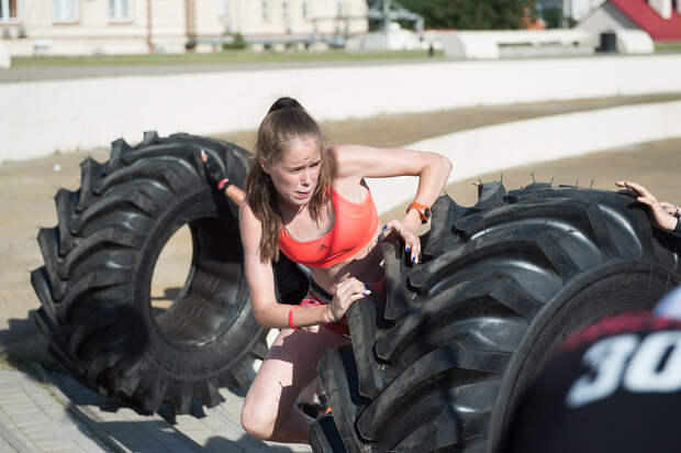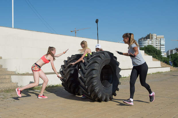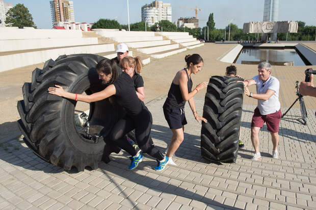 Второе испытание - гонки с шинами. Участники выступают парами по четыре команды одновременно. Девочкам разрешено катить: