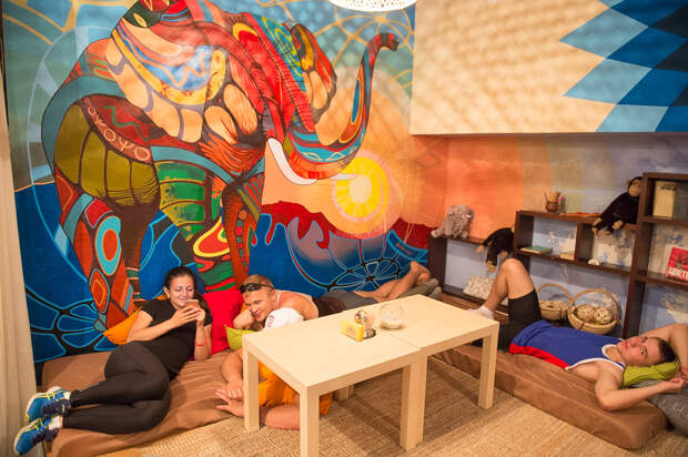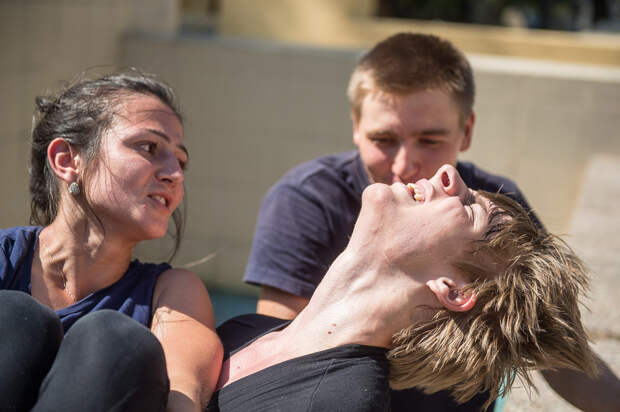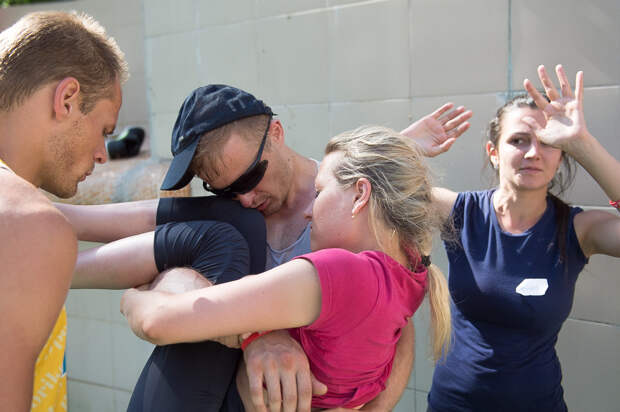 Одно из самых непростых заданий - групповые отжимания. Участники кладут друг другу ноги на спину и должны вместе оторваться от земли: