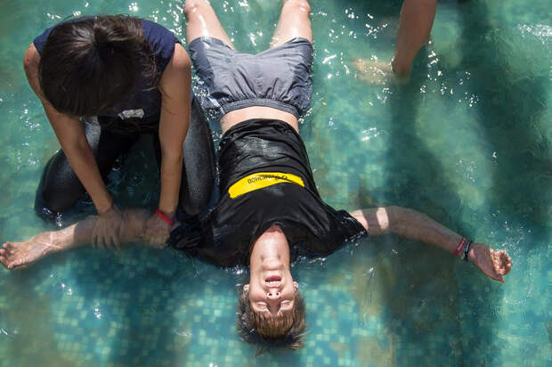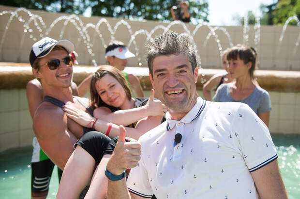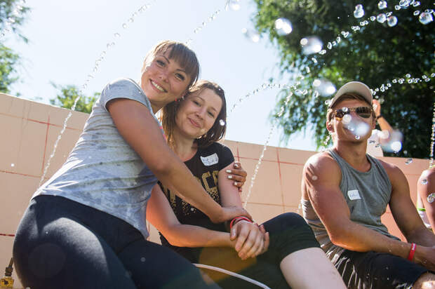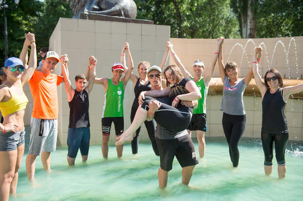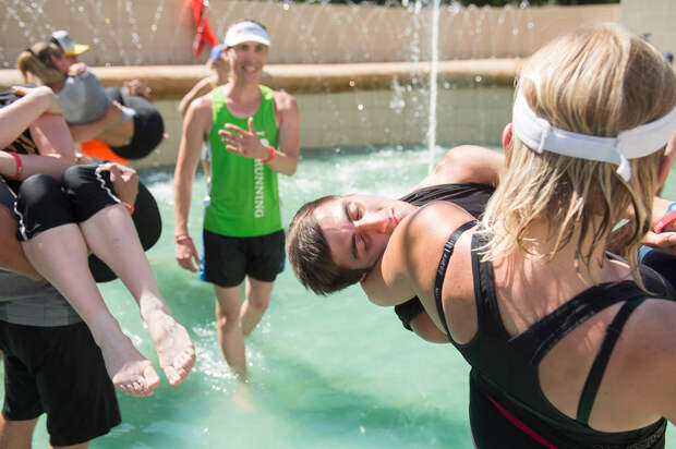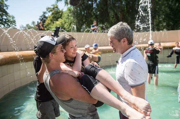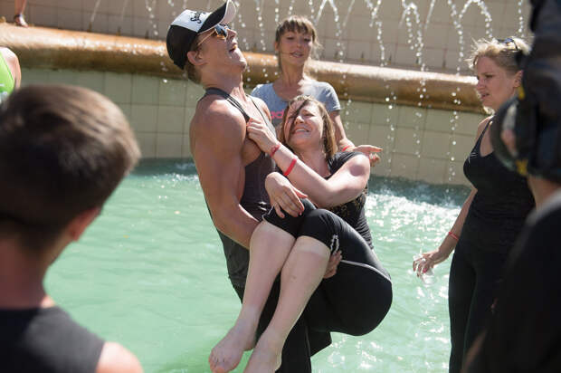 И наконец, самый последний конкурс, в ходе которого может измениться всё. Ребята должны продержать на руках девчонок. К тому моменту в городе жара поднялась под 40 градусов и мы решили провести состязание в фонтане: