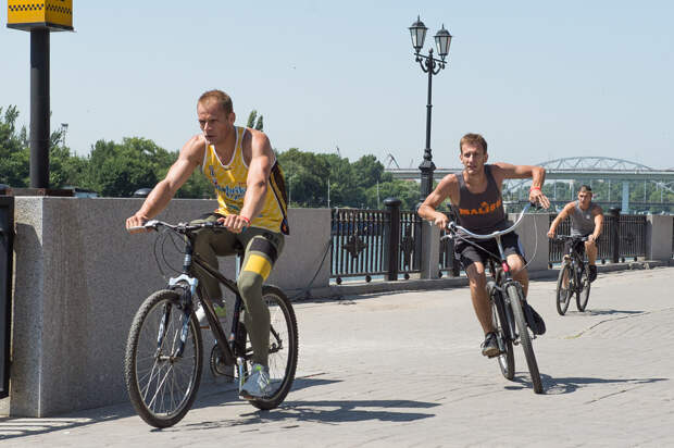 Показываю первую полосу препятствий перед стартом. Нужно преодолеть три круга на набережной: сперва бегом, затем на велосипедах и в конце на скакалках. В первом туре, как правило, отсекаются самые слабые - человек пять-шесть: