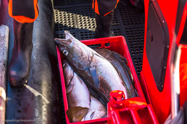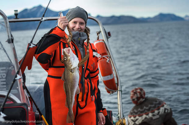 После сокрушительного провала с морской рыбалкой в районе Сторсезандетского моста, норвежские воды Шпицбергена сполна компенсировали прошлую неудачу. За 30 минут ловли на блесну у Мыса Старостина мы вытащили шесть рыбин трески и, без сомнений, наловили бы больше, если бы позволяло время. Но удивительно даже не это: ни одна из рыбин не была поймана за рот! Блесна случайным образом цеплялась за спину, брюхо или жабры. Остается только догадываться как много её на дне фьорда!