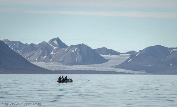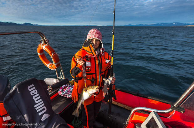 Чего не скажешь о местных рыбаках, которые вышли на середину фьорда на надувной лодке. Выглядит опасно: