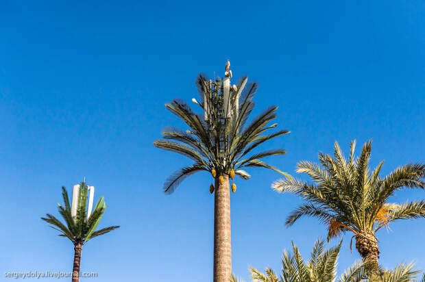 Закончим виртуальную экскурсию по Марракешу на технологичной и инновационной ноте. Если приглядеться к верхушкам пальм, можно заметить сотовые передатчики. Прикольная идея: