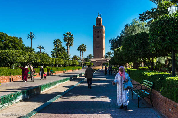 Мечеть Кутубия - самая большая мечеть Марракеша, известная 69-метровым минаретом. Внутри устроена лестница такой ширины, чтобы муэдзин мог въезжать по ней на жеребце:
