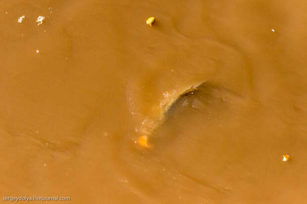 Карпов можно кормить но, во-первых, вода очень мутная и ничего не видно, во-вторых, сытые твари весьма обленились и почти не выплывают на поверхность: