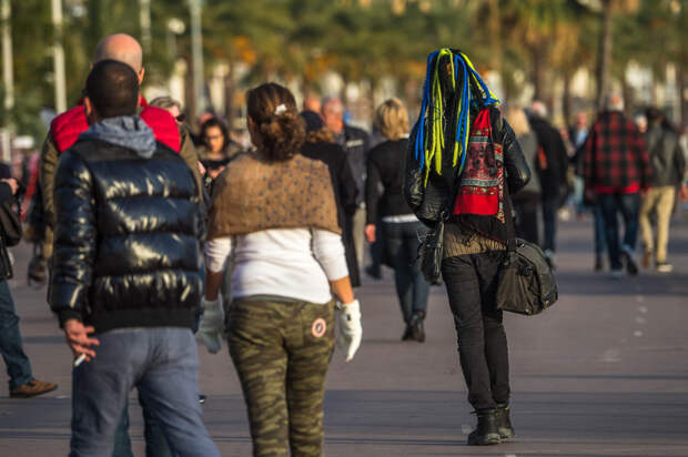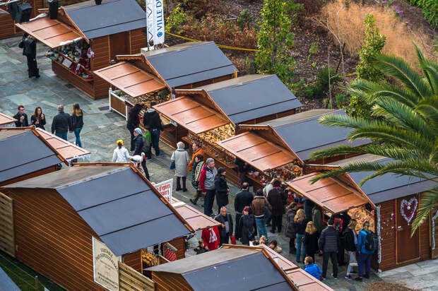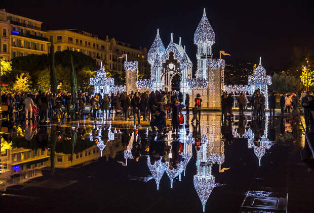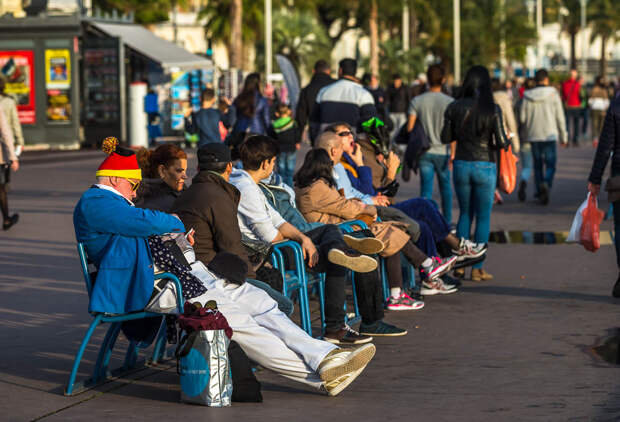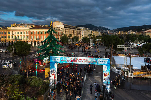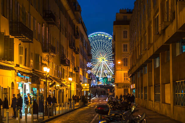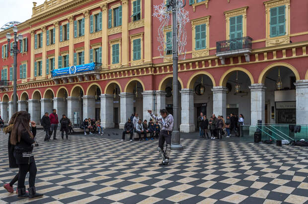 Тут кипит жизнь, гуляют туристы и выступают уличные артисты. На синей растяжке написано "Первое русско-французское радио. С Новым годом и Рождеством!". Удивительно, конечно, наблюдать, что в центре Ниццы висит банер на русском языке: