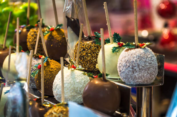 Яблоки в шоколаде. Честно говоря, никогда не ел их, и был уверен, что это запеченные яблоки, мягкие внутри. А тут решил попробовать. Оказалось - это свежие твердые яблоки в таком же твердом шоколаде. Не могу сказать, что очень понравились: