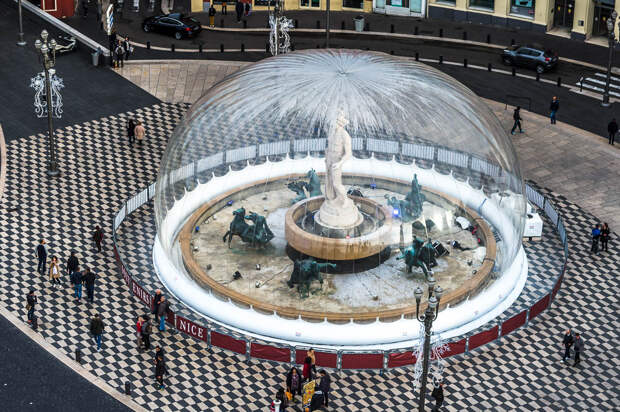 Фонтан накрыт пластиковым куполом, и в определенное время внутри выстреливает пушка с конфети. Из-за этого создается иллюзия, что фонтан - это огромный стеклянный шар со снегом: