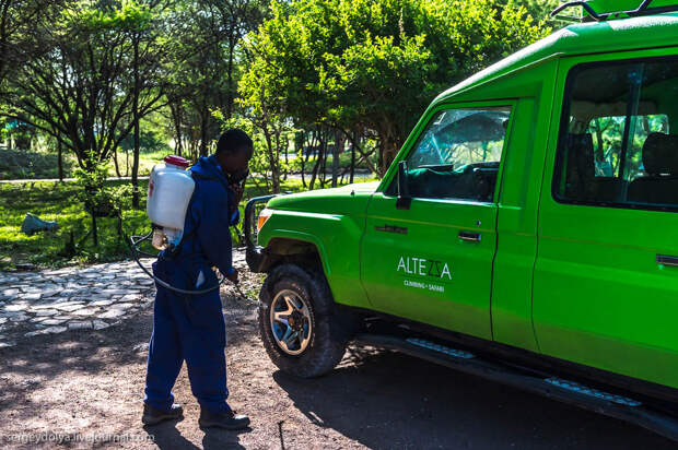 Первым делом на въезде в парк нам опрыскали колеса автомобиля: