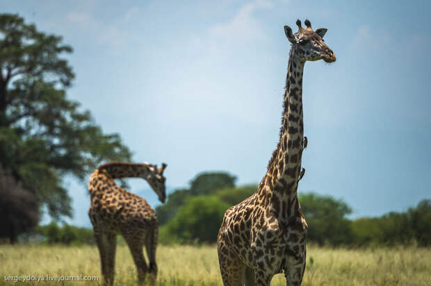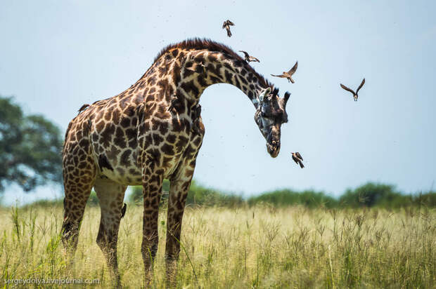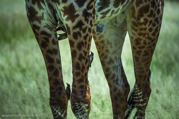 Как и на всей крупной африканской скотине, на жирафах обитают мелкие птички, которые клюют всяческих мошек и паразитов: