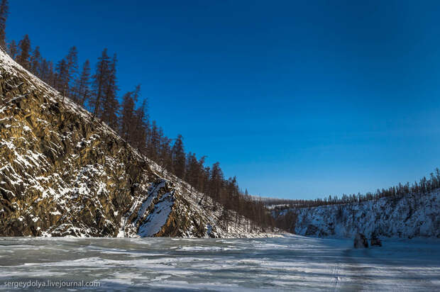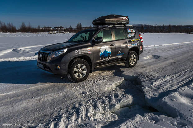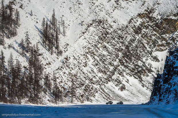 Несколько раз зимник выходил со льда на камни. Приходилось съезжать с колеи и ехать рядом, чтобы не чиркать днищем: