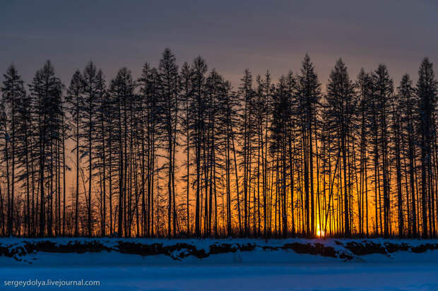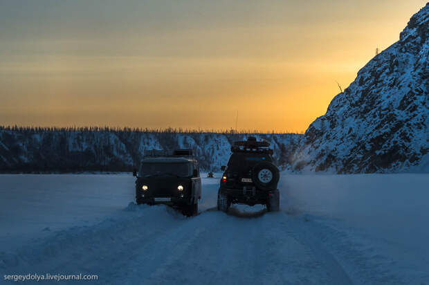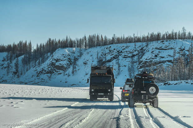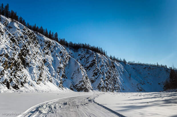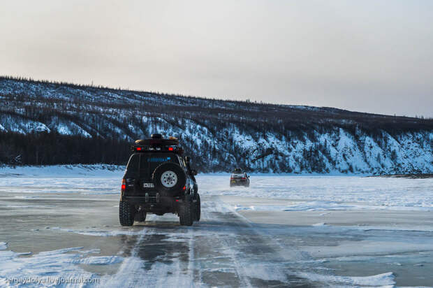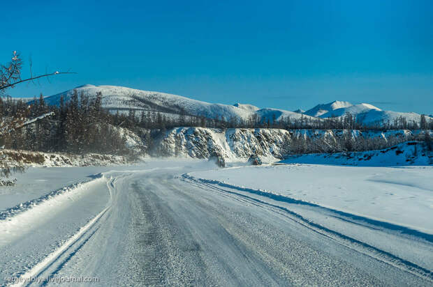 Всегда был уверен, что чистый и прозрачный лёд бывает только на Байкале. Но это не лёд Байкала. Это зимник на замерзшей реке Адыча в Якутии. Днем ранее мы встали на распутье и долго думали какую дорогу выбрать: короткую и медленную, но по суше или длинную, но быструю по льду? Несмотря на опасность наледи и риска провалиться под воду, мы предпочли второй вариант. ..
